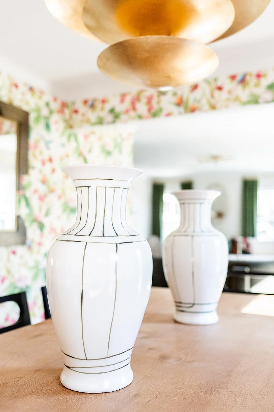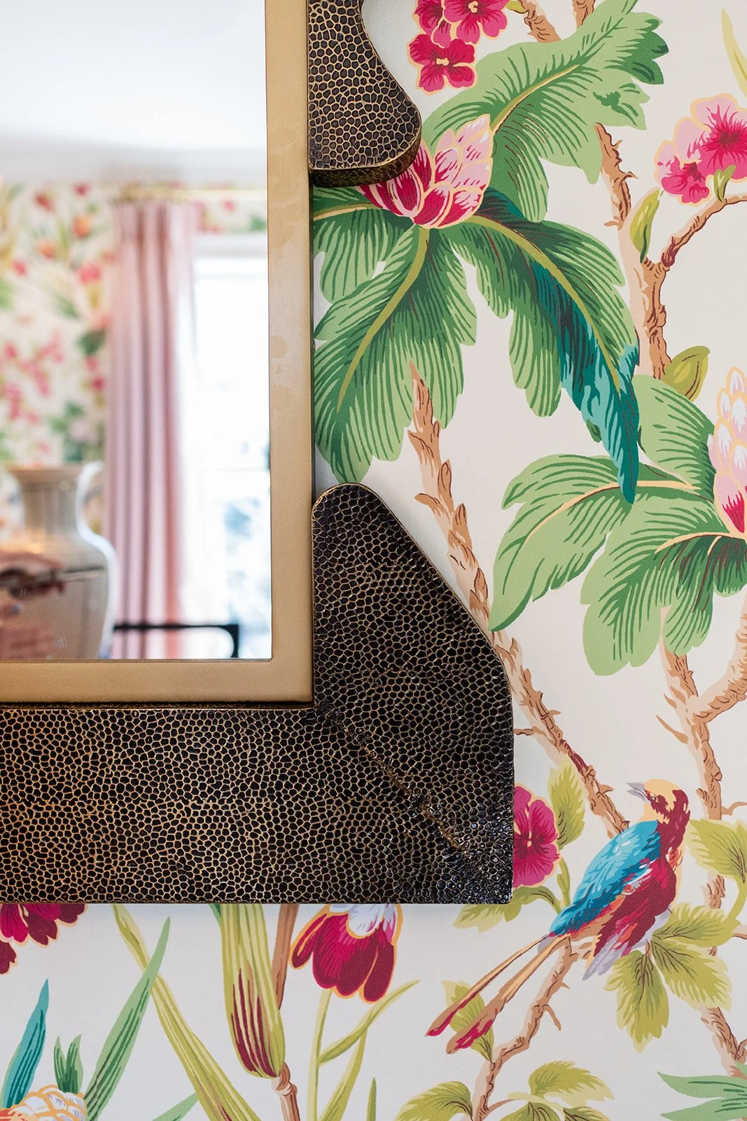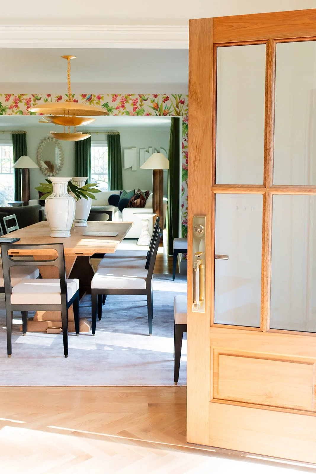 The client’s office embraces color and contrast, featuring soft pink walls with orange trim and a bold floral fabric set against a black ground. In the dining room, a traditional Schumacher wallpaper is paired with contemporary chairs and a Jaipur Rugs rug, creating a space that feels timeless yet fresh.
