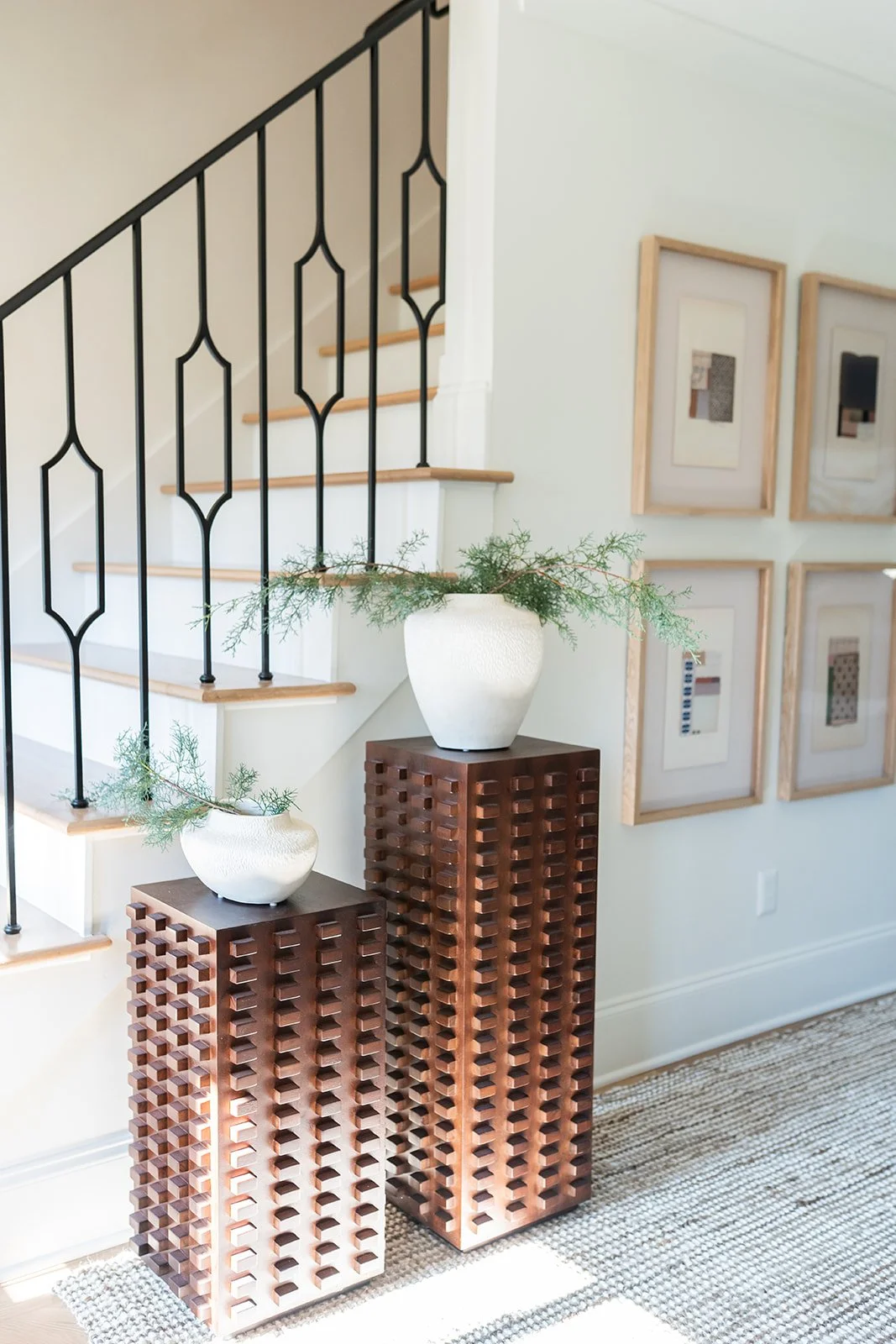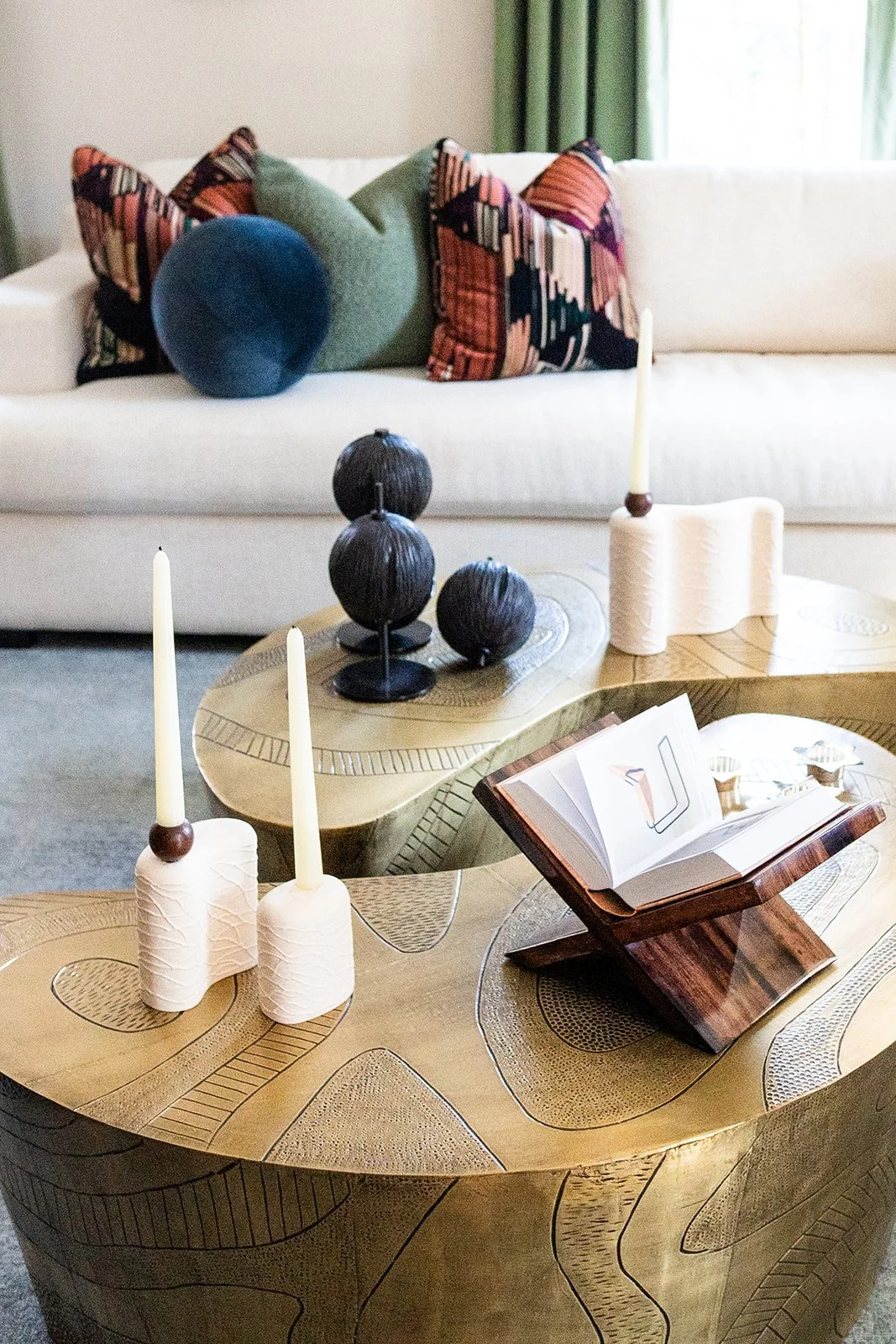 Furnishings and finishes throughout the home were curated from Noir Furniture, Made Goods, balancing warmth with modern lines. Two living rooms were designed to feel distinct and connected with layered seating, sculptural moments, and visual depth from the entry forward.
