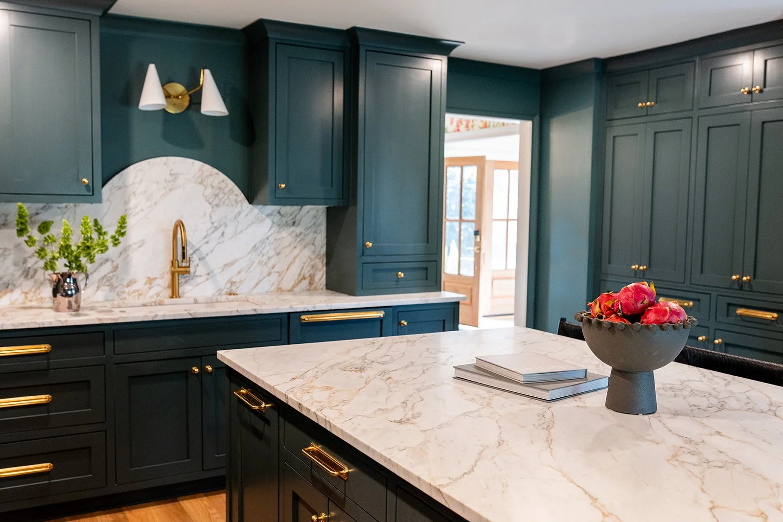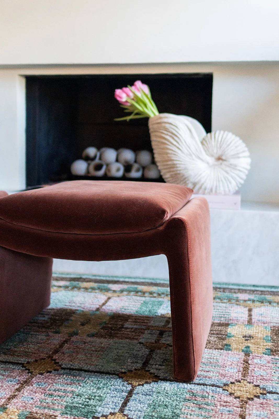 The design draws from the firm’s more moody, contemporary work, layered with color, texture, and a strong sense of personality. A custom fireplace anchors the main living area, while the kitchen pairs sculptural brass fixtures with Pink Rhino marble, creating a space that feels bold and grounded.