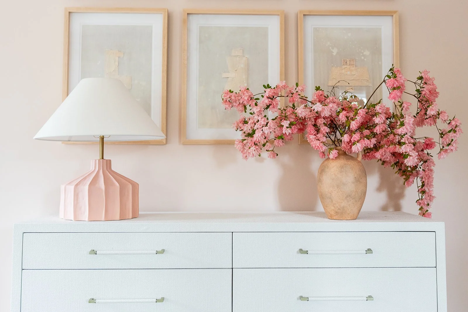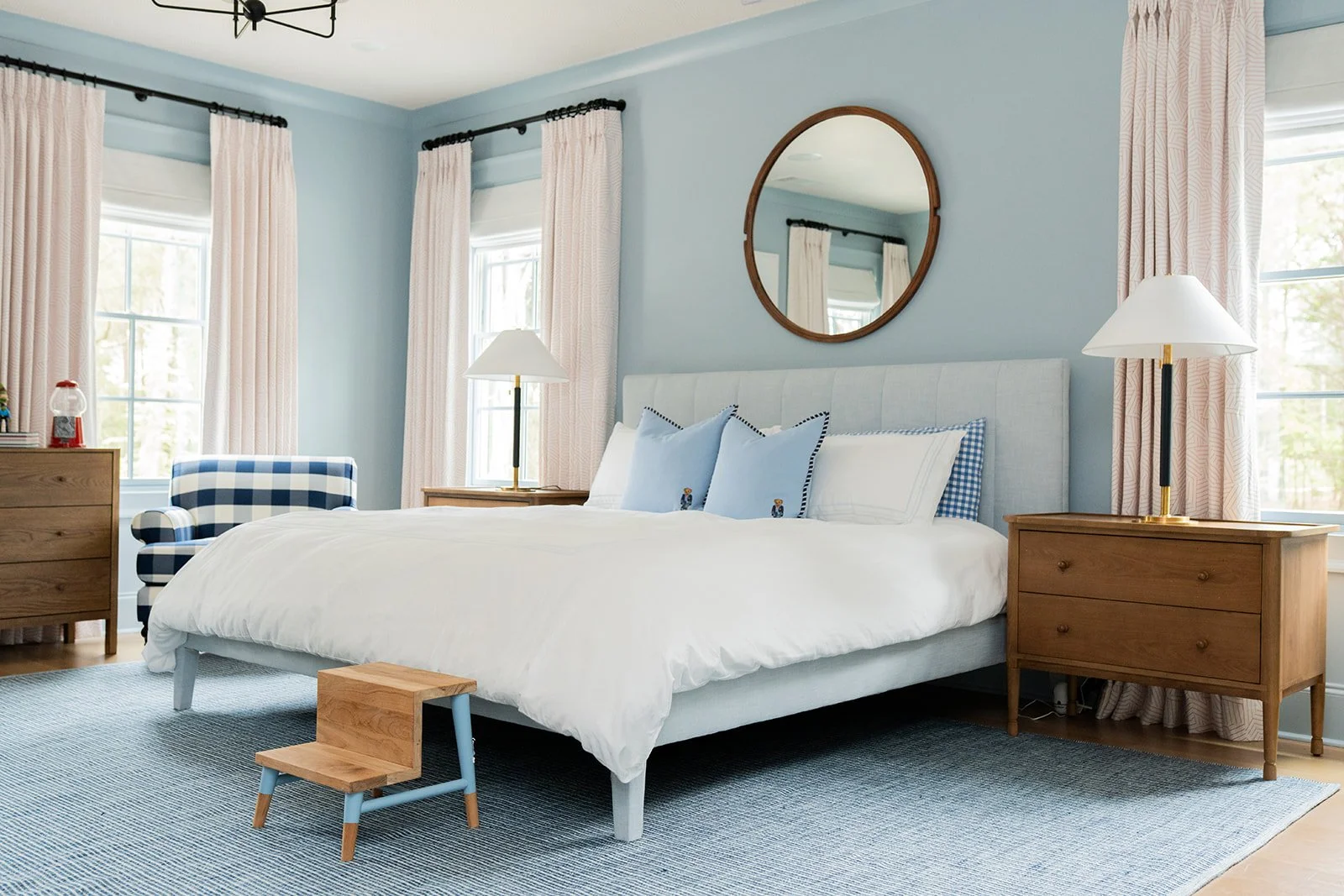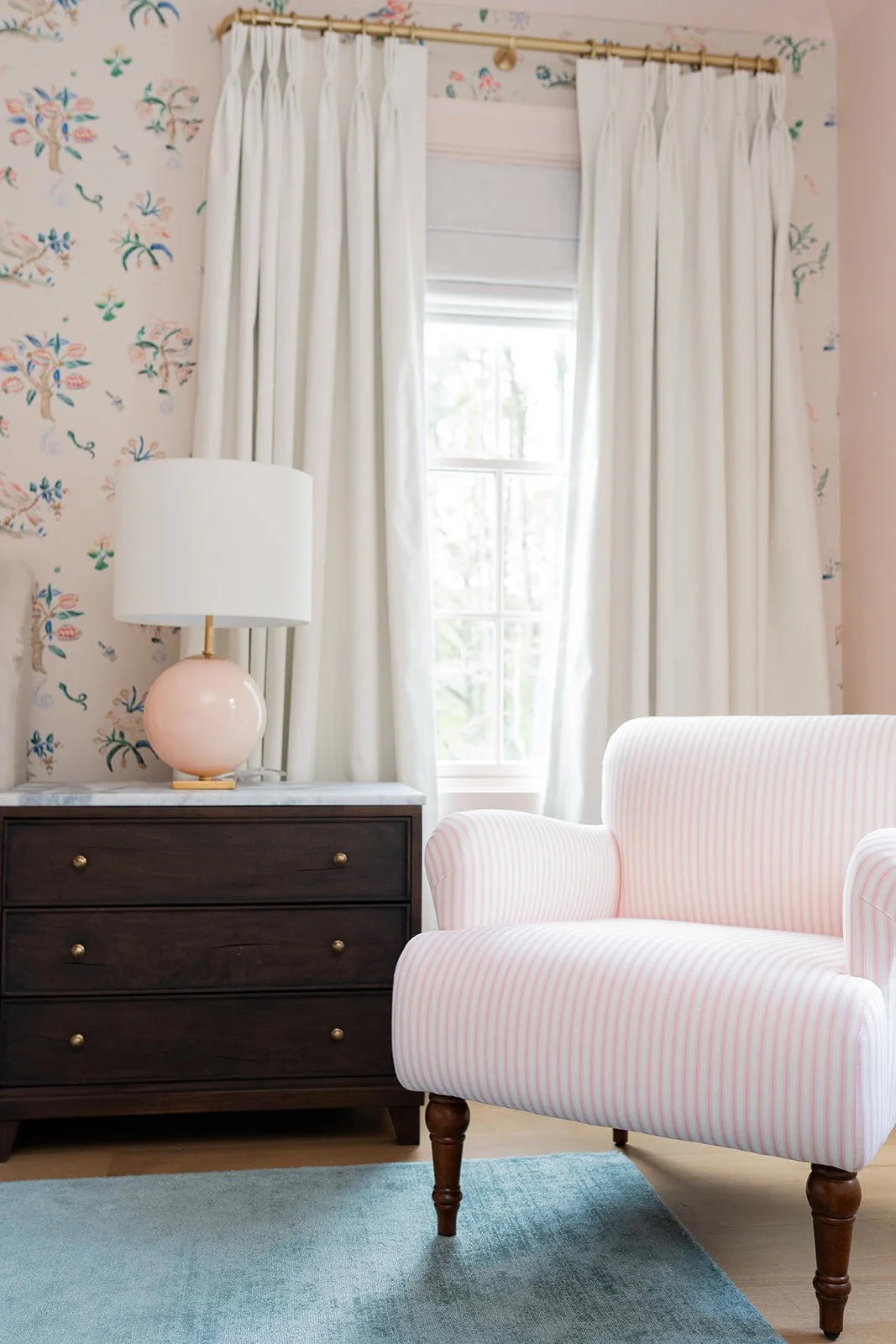 The daughter’s bedroom, currently a nursery, is a study in softness and quiet elegance. Blush-toned walls wrap the space in warmth, complemented by flowing ivory velvet drapery, all of which are custom and designed with longevity in mind. A relaxed linen slipcovered queen bed offers both comfort and versatility, while a whimsical wallpaper mural sets a dreamy tone. Thoughtful details like Kate Spade lamps provide a hint of playful polish, ensuring the room feels fresh now and remains functional and beautiful as she grows.