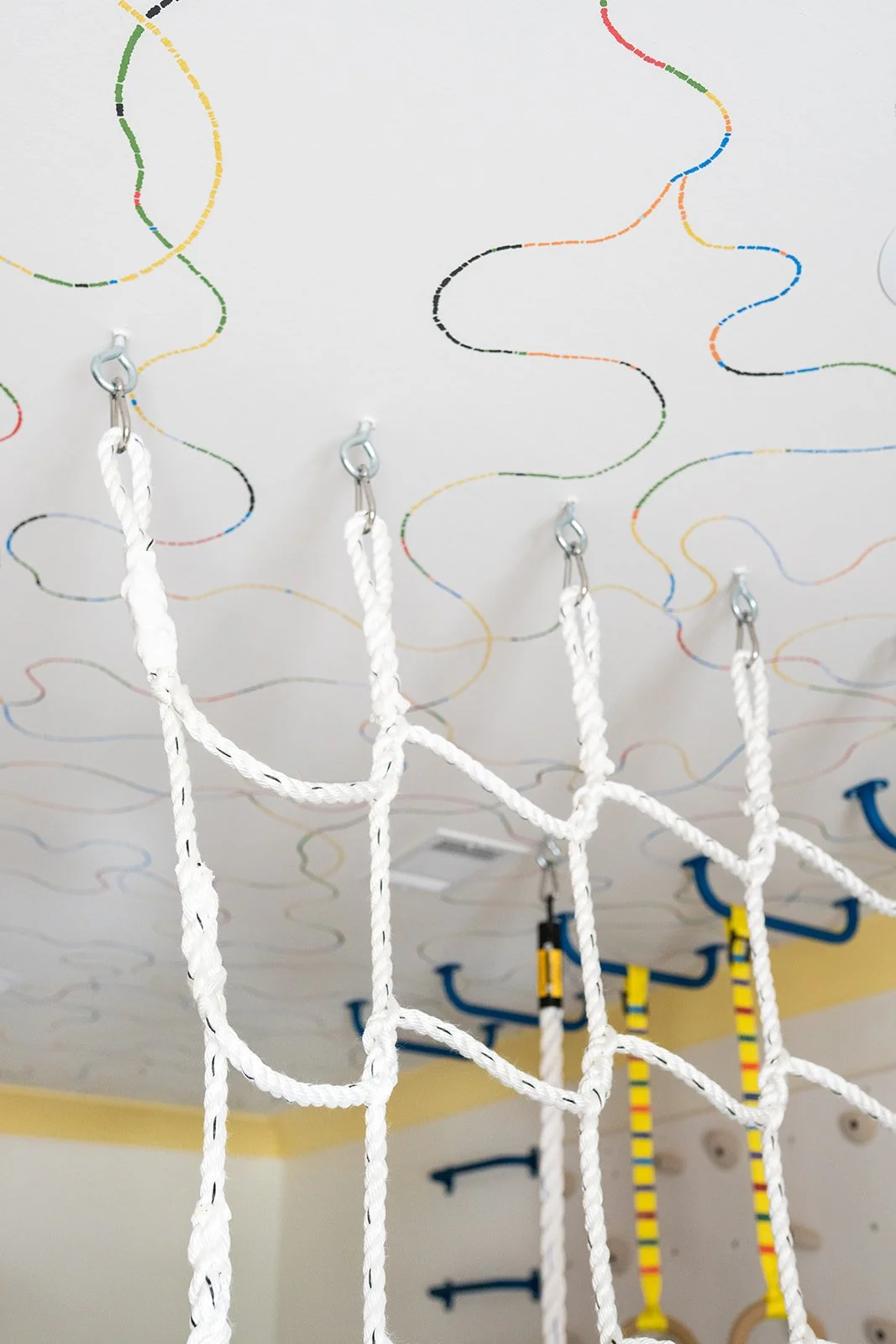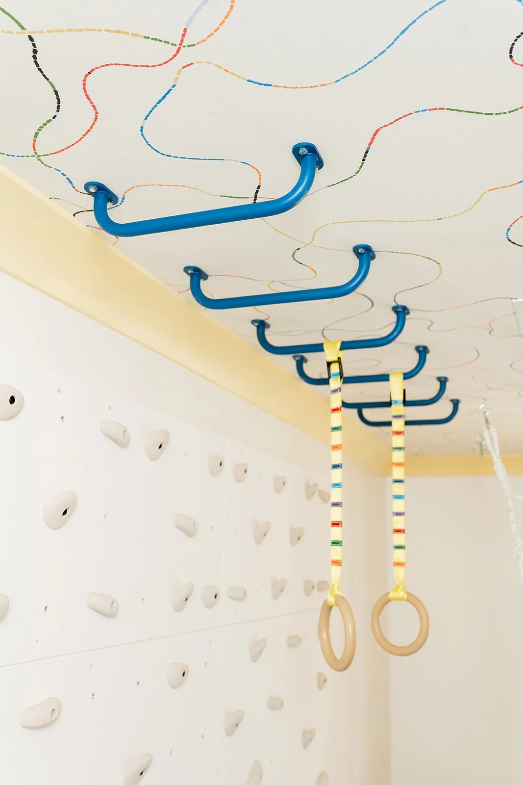 Downstairs, the sensory playroom bursts with energy. Designed for movement and exploration, it includes monkey bars, swings, a ball pit, and climbing walls, with every detail encouraging active play. Sunny yellow trim and cheerful Schumacher wallpaper keep the space light, vibrant, and visually stimulating, creating an environment that supports both fun and development. It’s a spirited retreat for a young, dynamic family where design meets joy at every turn.