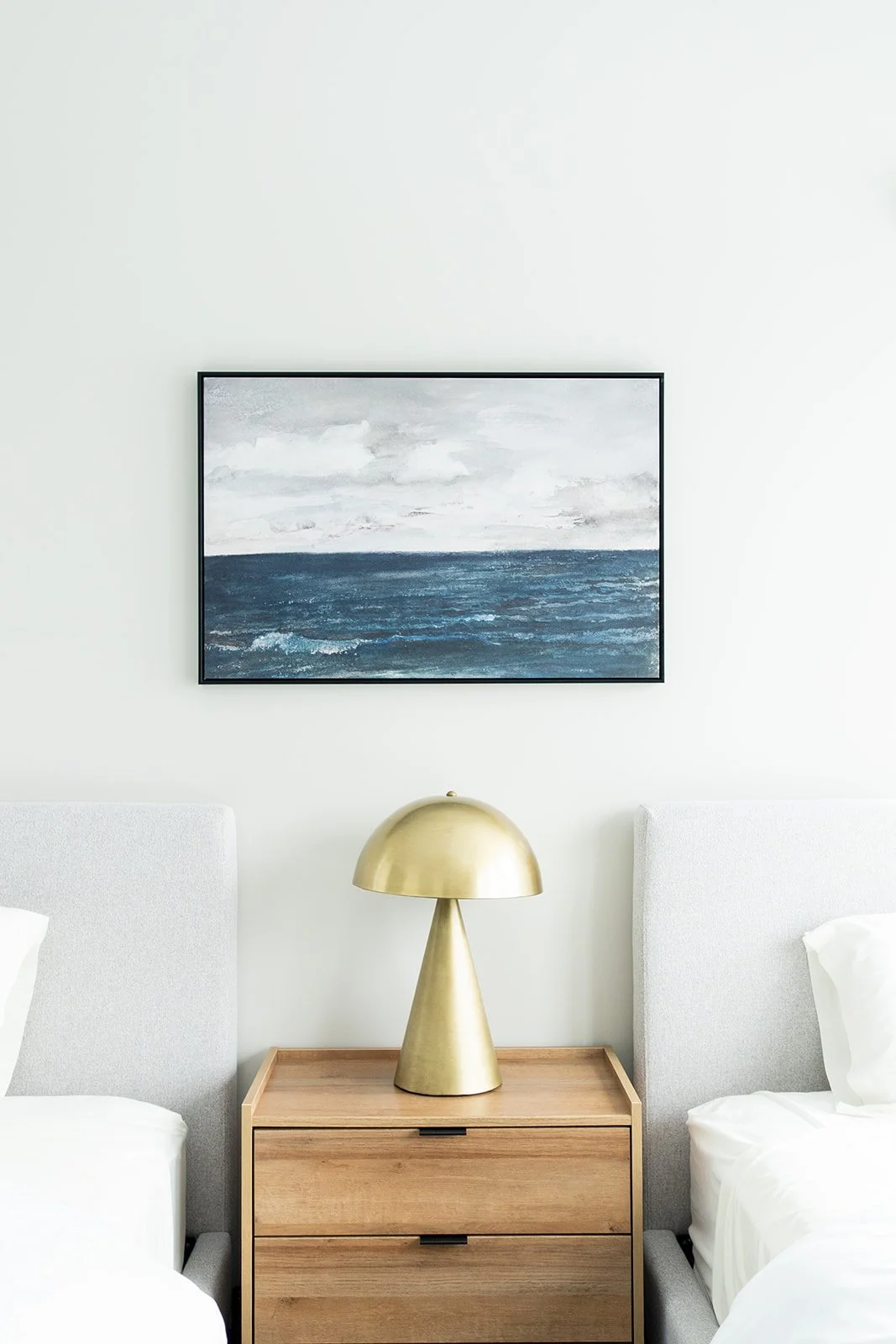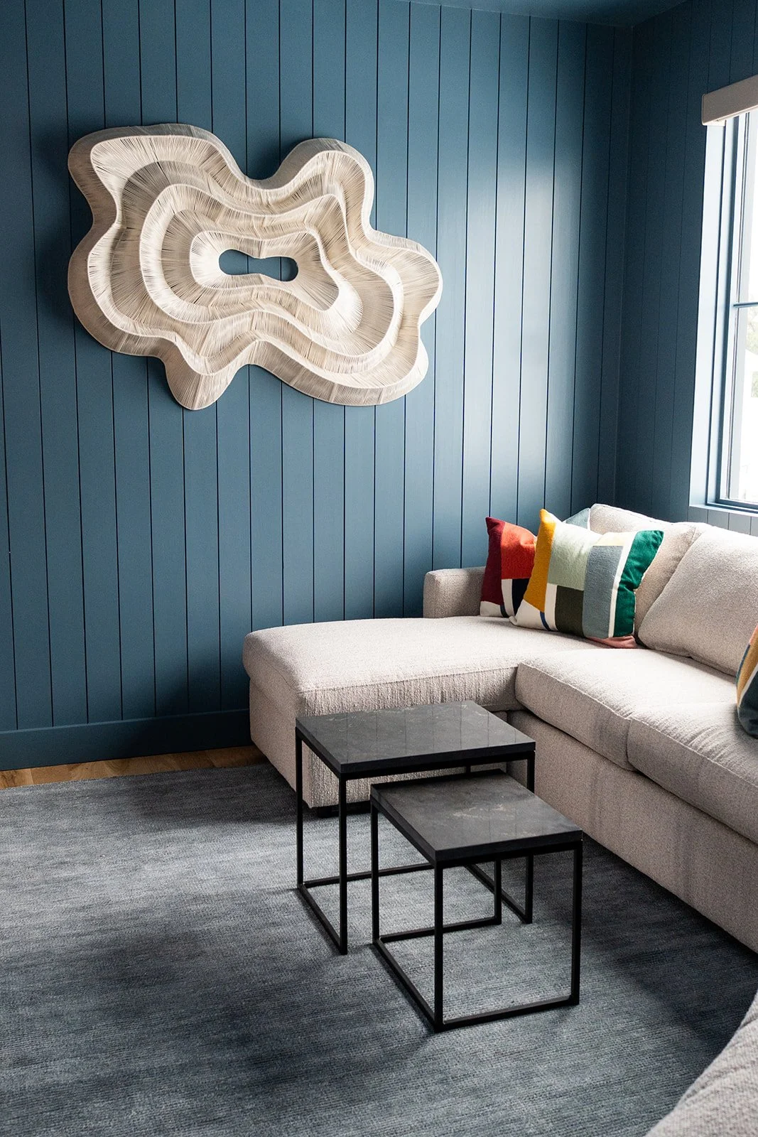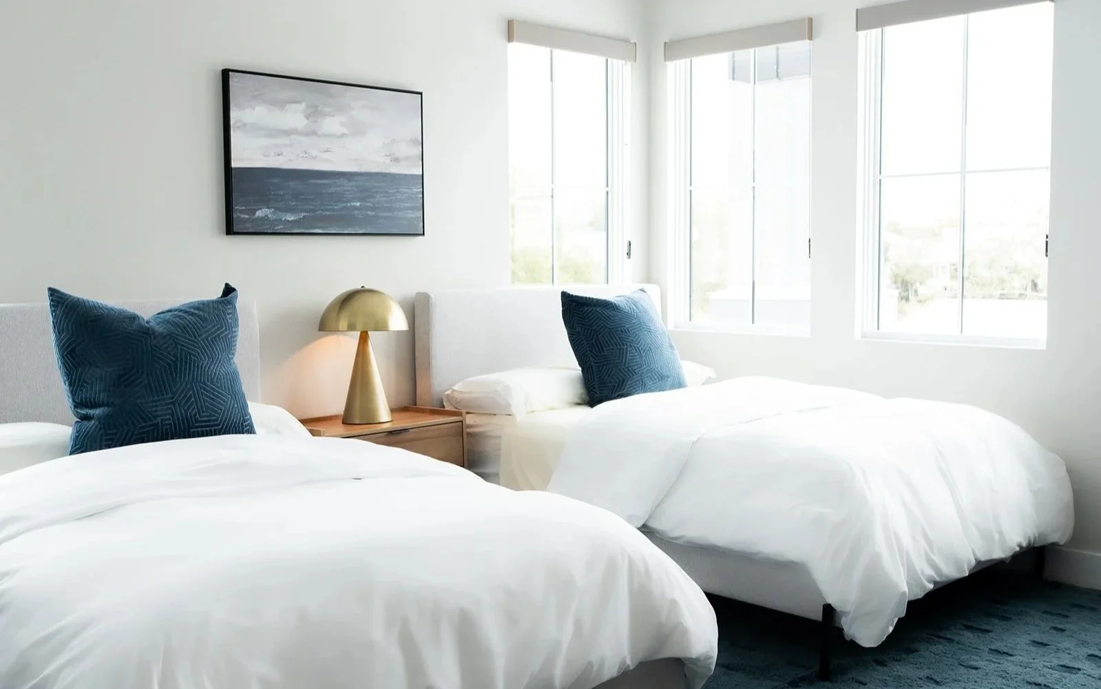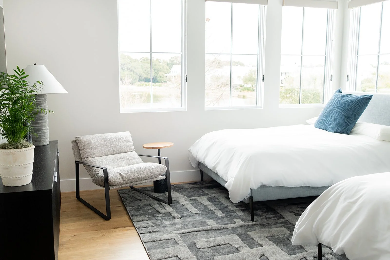 While the architecture embraces sleek, modern lines, we’ve subtly drawn inspiration from the coastal environment to introduce balance and warmth. Thoughtfully curated lighting selections enhance the home's refined elegance, while rich wood tones and deep blue hues anchor the space, echoing the natural beauty of the shoreline. The result is a dynamic contrast—where crisp, clean finishes meet organic textures for a truly bespoke living experience.