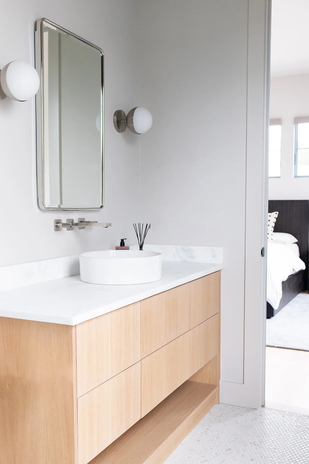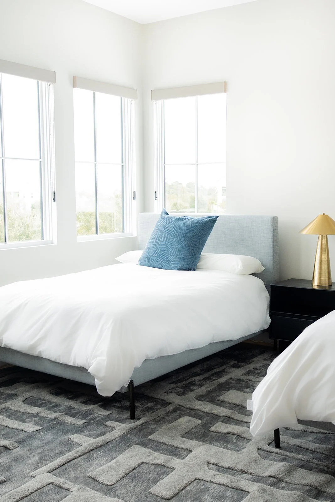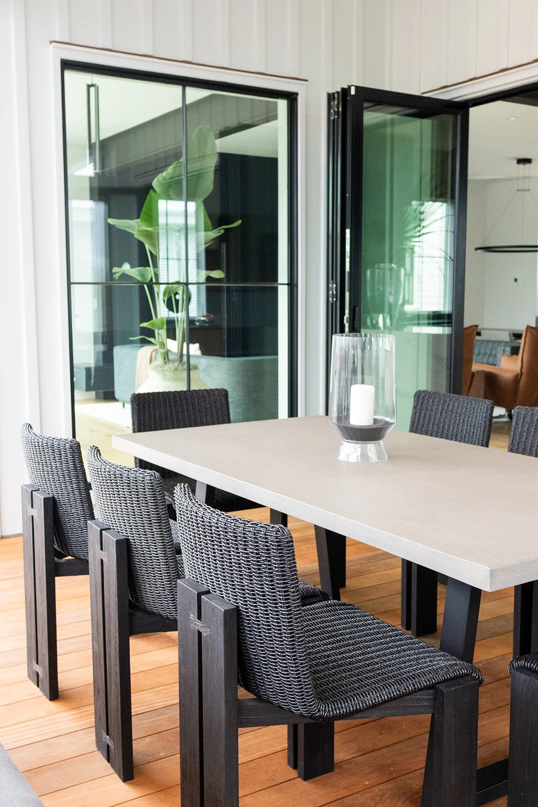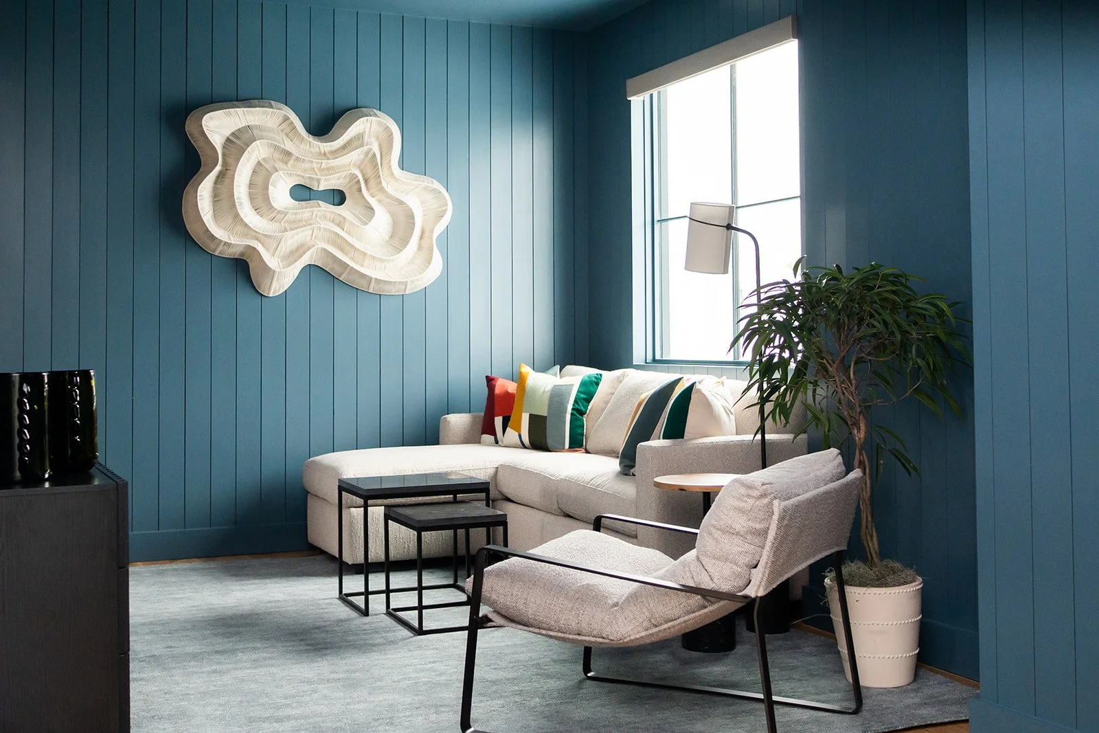 While the architecture embraces sleek, modern lines, we’ve subtly drawn inspiration from the coastal environment to introduce balance and warmth. Thoughtfully curated lighting selections enhance the home's refined elegance, while rich wood tones and deep blue hues anchor the space, echoing the natural beauty of the shoreline. The result is a dynamic contrast—where crisp, clean finishes meet organic textures for a truly bespoke living experience.